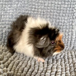 Sort/hvid/gylden satin hvirvelkæledyr, hun. Født 12.5.25. Datter af Cookie og Mouse