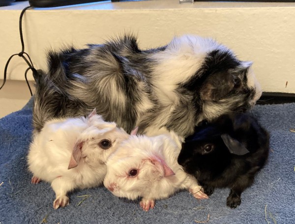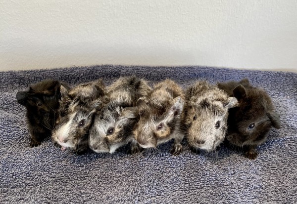 Fem fine hvirvelkrydsninger, som overraskende nok alle er satin. Mouse vidste jeg var satinbærer, men Cookie har kun satin i 3. led på stamtavlen, så det var lidt en overraskelse at hun var satinbærer, og rent statistisk lidt vildt med et helt kuld satiner på to bærere, når man kun ville forvente 25%.